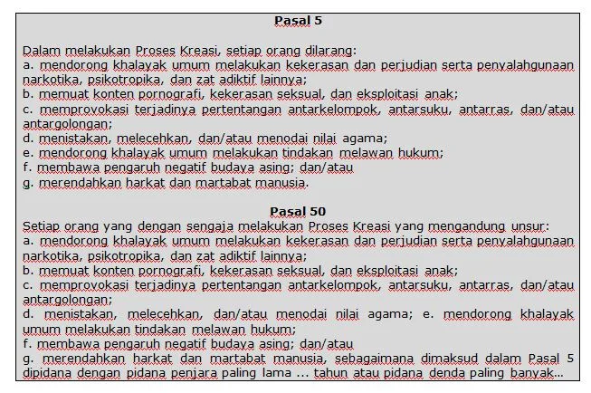 Persoalannya, ada dalam Pasal 5 jo Pasal 50 RUU Permusikan yang beberapa isinya menerangkan bahwa dalam melakukan proses kreasi, setiap orang dilarang; mendorong khalayak umum melakukan kekerasan dan perjudian serta penyalahgunaan narkotika, psikotropika, dan zat adiktif lainnya; memuat konten pornografi, kekerasan seksual, dan eksploitasi anak; serta merendahkan harkat dan martabat manusia.